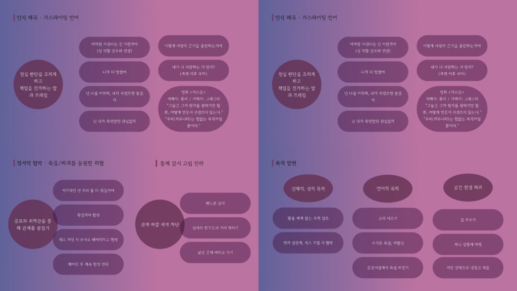 그중 제가 인상 깊었던 부분은 내가 교제폭력의 가해자가 될 수도 있다는 두려움에 대한 것이었어요. 몇몇 분들의 발언을 통해 여성퀴어들 중 교제폭력의 존재와 심각성을 인지하는 사람들은 본인의 어떤 행동이 가해자가 될 수도 있다는 지점을 명확하게 알고 있다는 생각이 들었어요. 그래서 일반적인 교제폭력 피해 체크리스트를 보면 저 역시 ‘이거 나 아냐?’ 하고 헉 하는 부분이 있곤 해요. 건강하고 안전한 관계와 교제폭력 사이에 엄청난 간극이 있다고 생각될 수도 있지만 한 끗 차이이고, 누구든 언제든 상대에게 피해를 줄 수 있다는 점을 다시 한번 생각하게 되는 것 같아요.