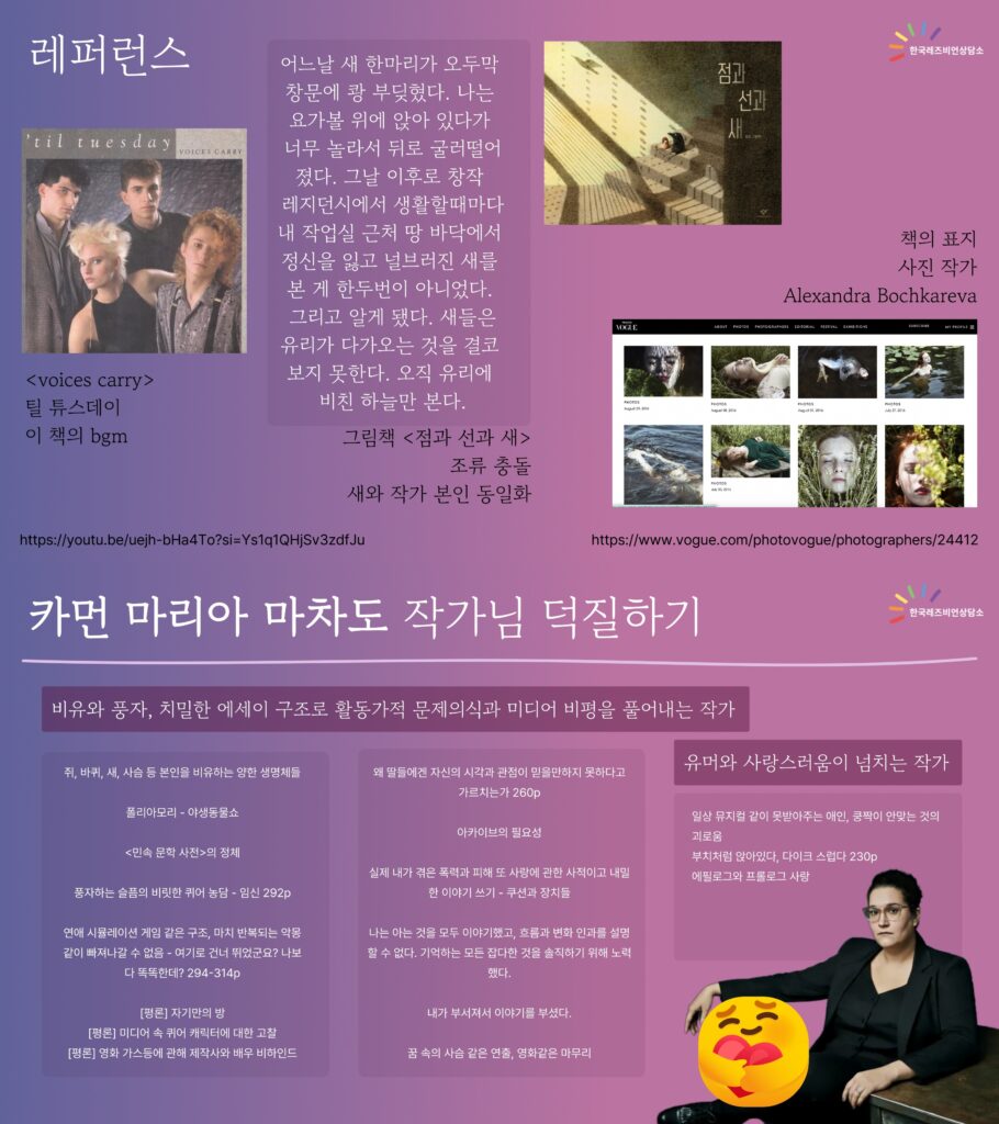 모임에서는 책 후기와 경험담을 비롯해 아우팅 위험, 퀴어에 대한 낙인 우려 등 여성간 교제폭력 발화를 어렵게 하는 요인에 대한 다양한 이야기가 나왔고 모두가 모두의 이야기를 경청하고 존중하는 분위기에서 편안하게 이야기 나눌 수 있어 좋았습니다. 이끔이 채원님이 준비해준 PPT를 통해 책을 더 깊이있게 알아갈 수 있었어요. 소개받은 레퍼런스 중에 책에 언급되었던 ‘Voices carry’라는 곡! 너무 좋습니다.