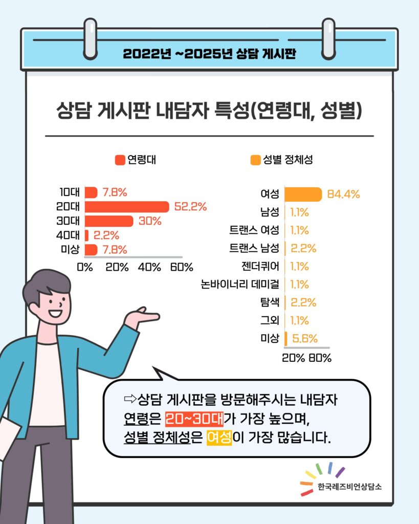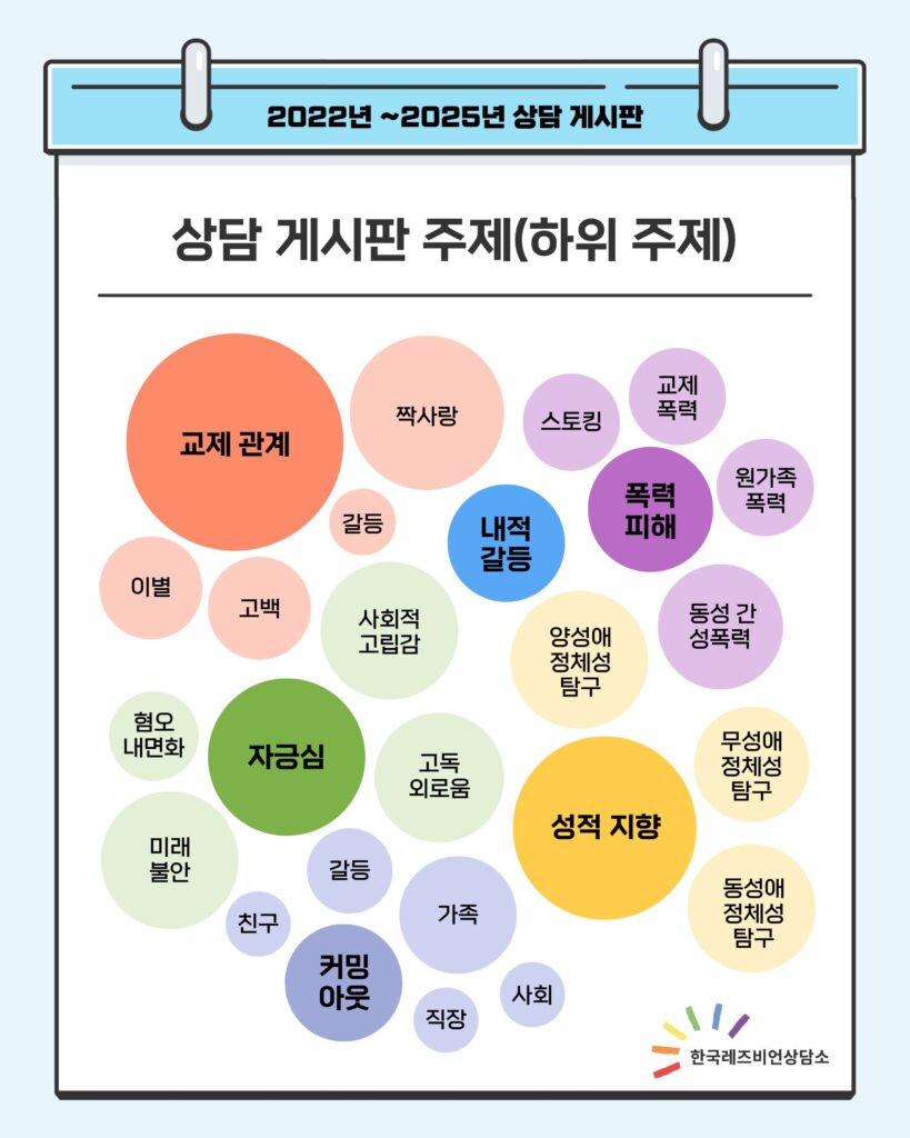 매년 한국레즈비언상담소 상담게시판을 찾아오는 분들이 조금씩 늘고 있습니다. 고민과 경험을 나누기 위해 상담게시판을 찾아주시는 분들께 감사의 마음을 전합니다.💖