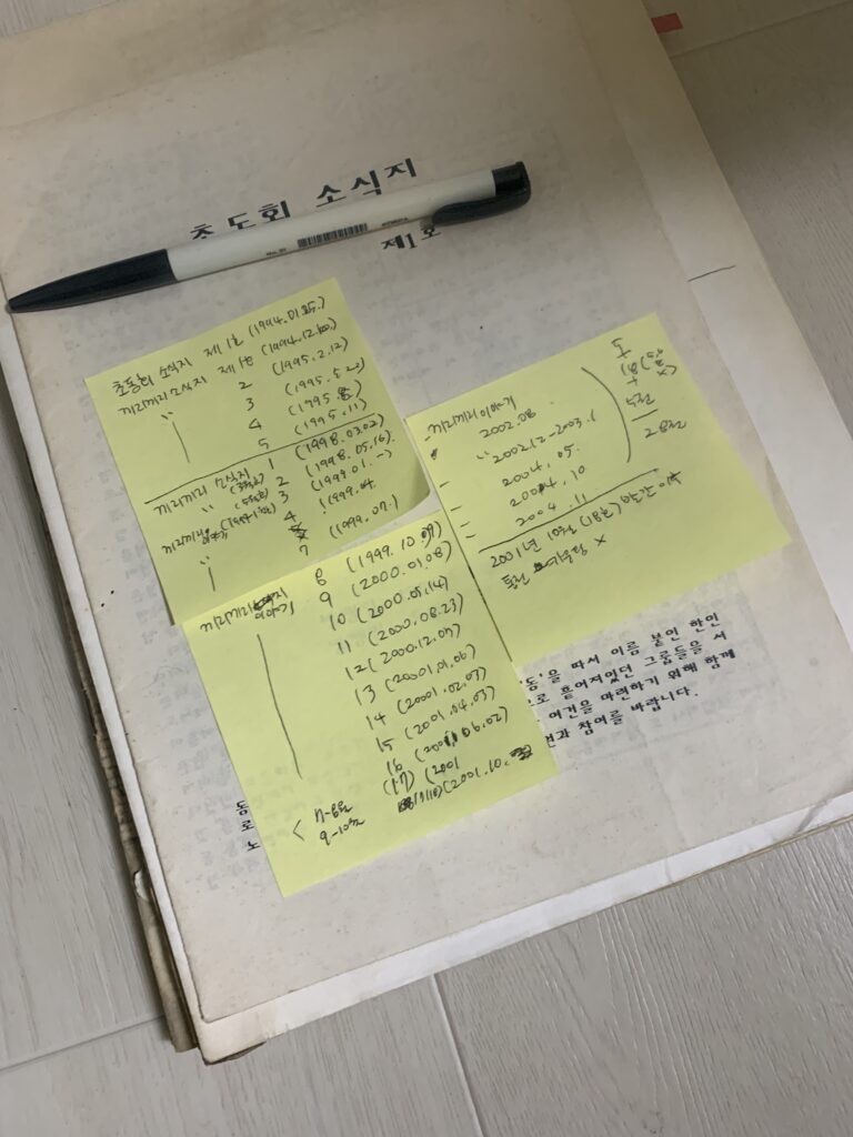 - 회원 활동 자료, 설문지, 편지 등 발견