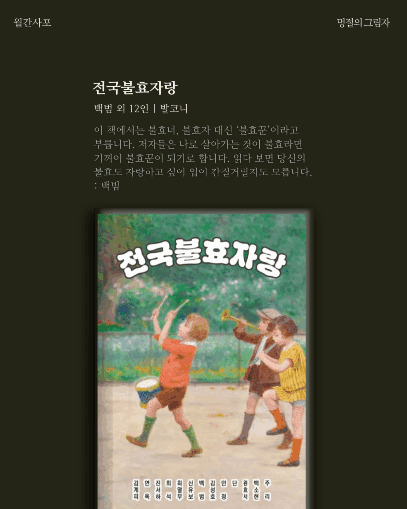 이 책에서는 불효녀, 불효자 대신 ‘불효꾼’이라고 부릅니다. 저자들은 나로 살아가는 것이 불효라면 기꺼이 불효꾼이 되기로 합니다. 읽다 보면 당신의 불효도 자랑하고 싶어 입이 간질거릴지도 모릅니다. _백범