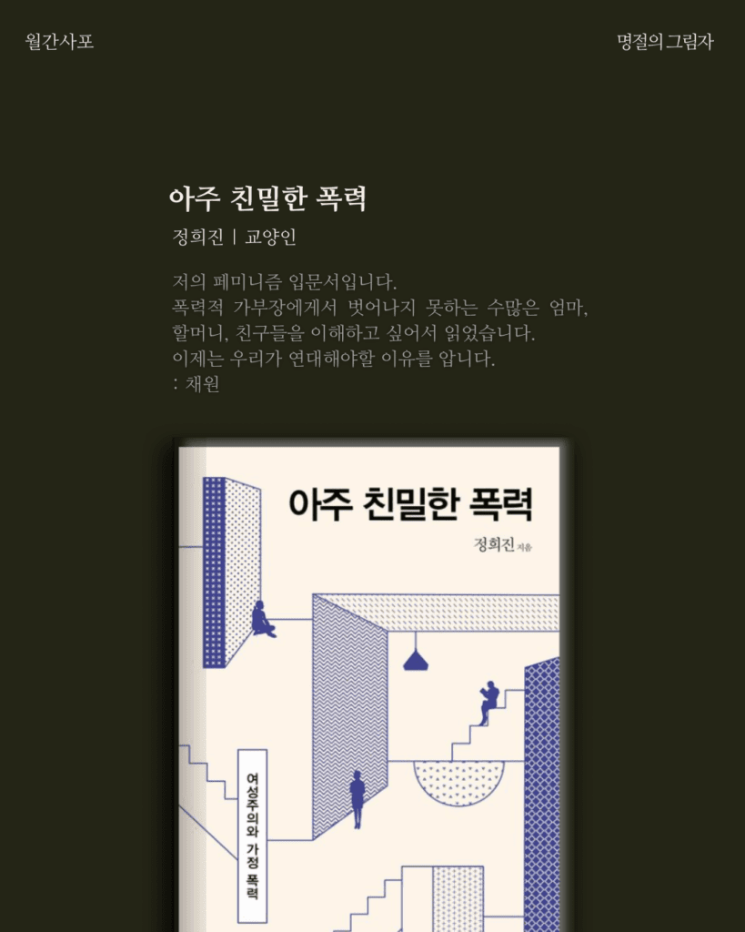 저의 페미니즘 입문서입니다. 폭력적 가부장에게서 벗어나지 못하는 수많은 엄마, 할머니, 친구들을 이해하고 싶어서 읽었습니다. 이제는 우리가 연대해야 할 이유를 압니다. _채원