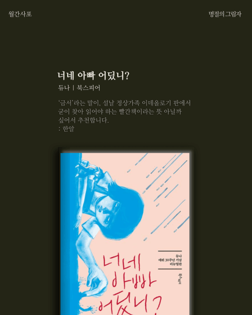 ‘금서’라는 말이, 설날 정상가족 이데올로기 판에서 굳이 찾아 읽어야 하는 빨간책이라는 뜻 아닐까 싶어서 추천합니다. _한알