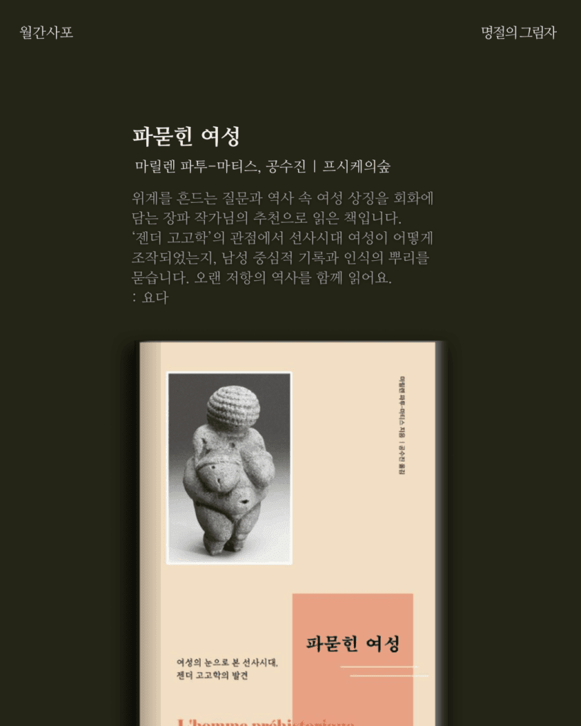 위계를 흔드는 질문과 역사 속 여성 상징을 회화에 담는 장파 작가님의 추천으로 읽은 책입니다. ‘젠더 고고학’의 관점에서 선사시대 여성이 어떻게 조작되었는지, 남성 중심적 기록과 인식의 뿌리를 묻습니다. 오랜 저항의 역사를 함께 읽어요. _요다