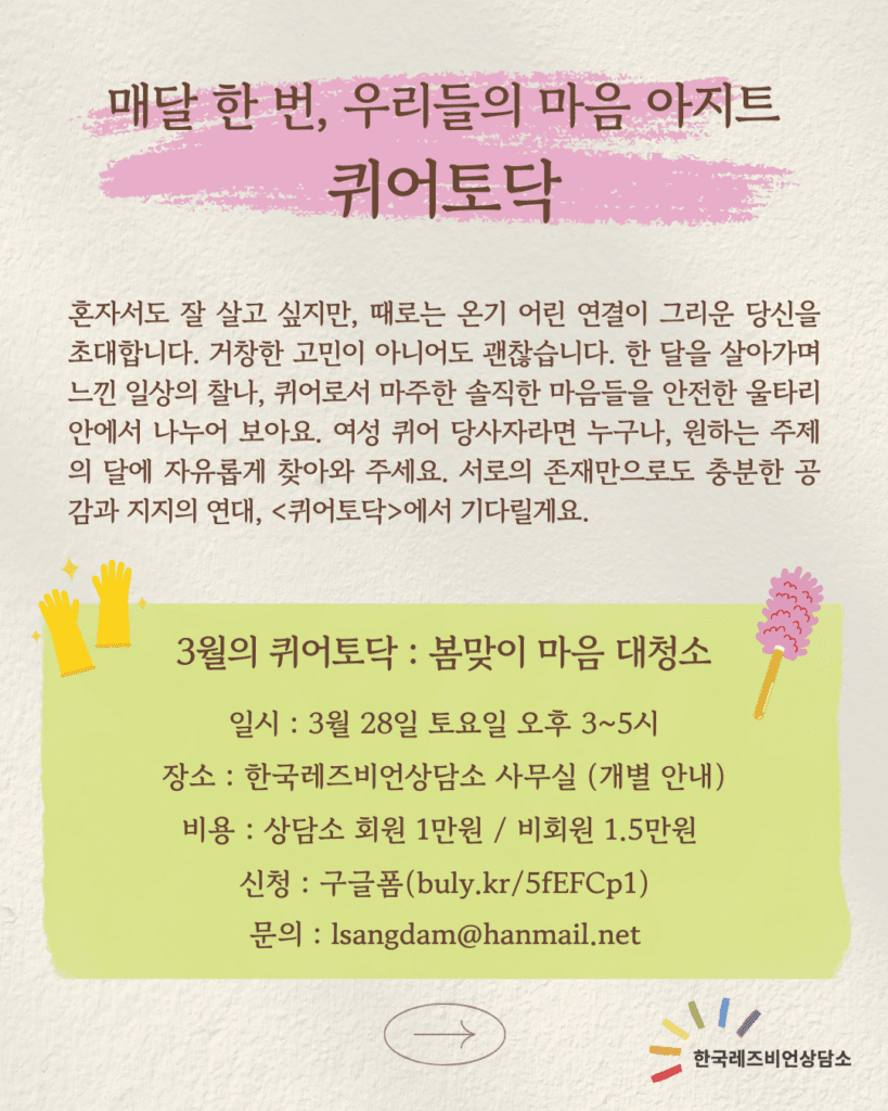 – 참가비 : 1회: 10,000원 (한국레즈비언상담소 회원), 15,000원 (비회원)