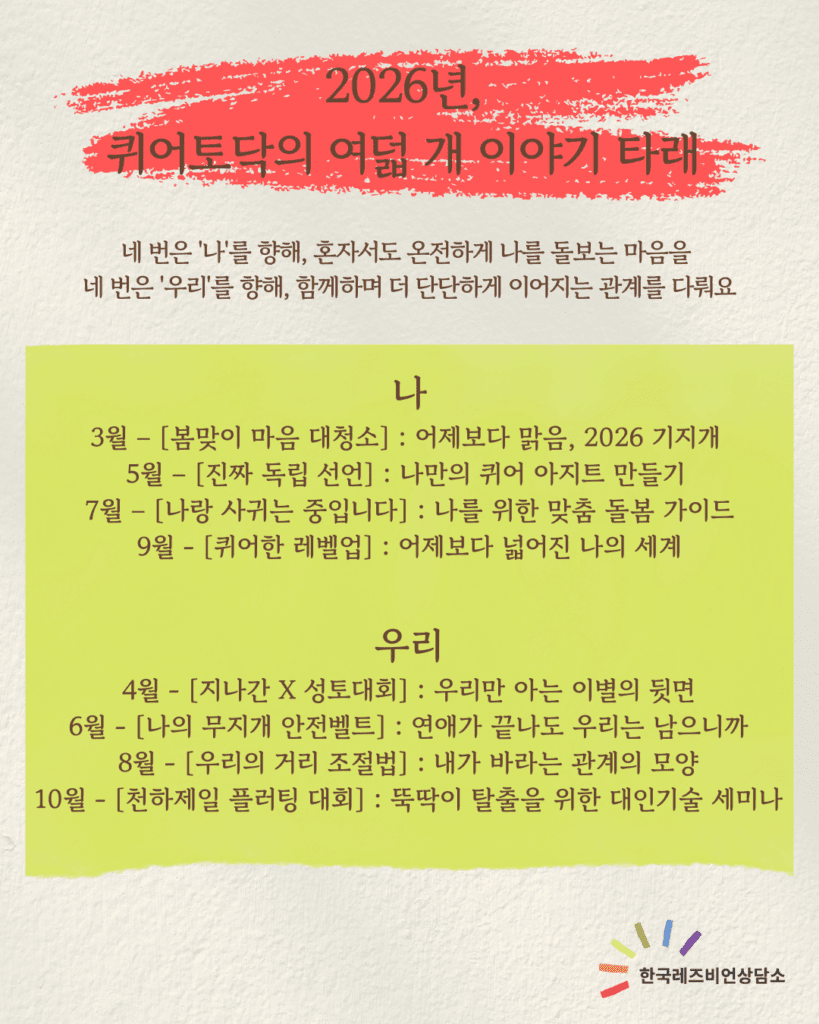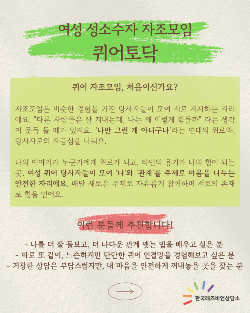 ※ 본 프로그램은 여성 성소수자 인권운동 단체인 한국레즈비언상담소에서 마련한 자조모임으로, 한국레즈비언상담소 상담팀 소속의 전문 심리상담가가 진행합니다.