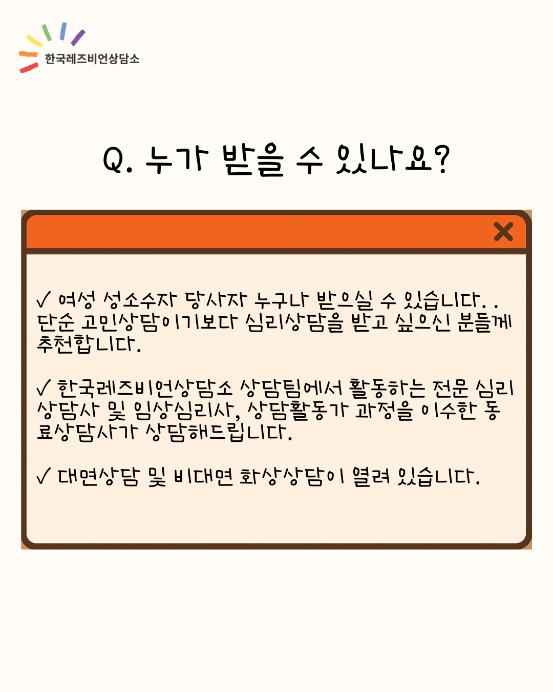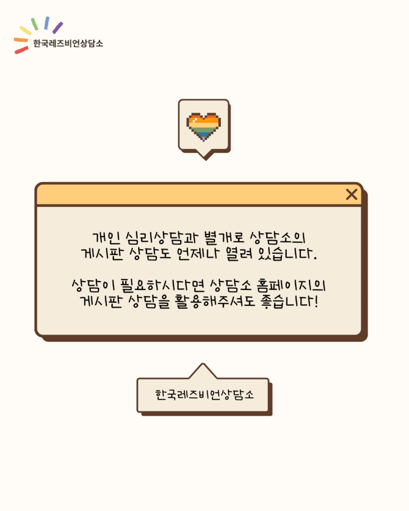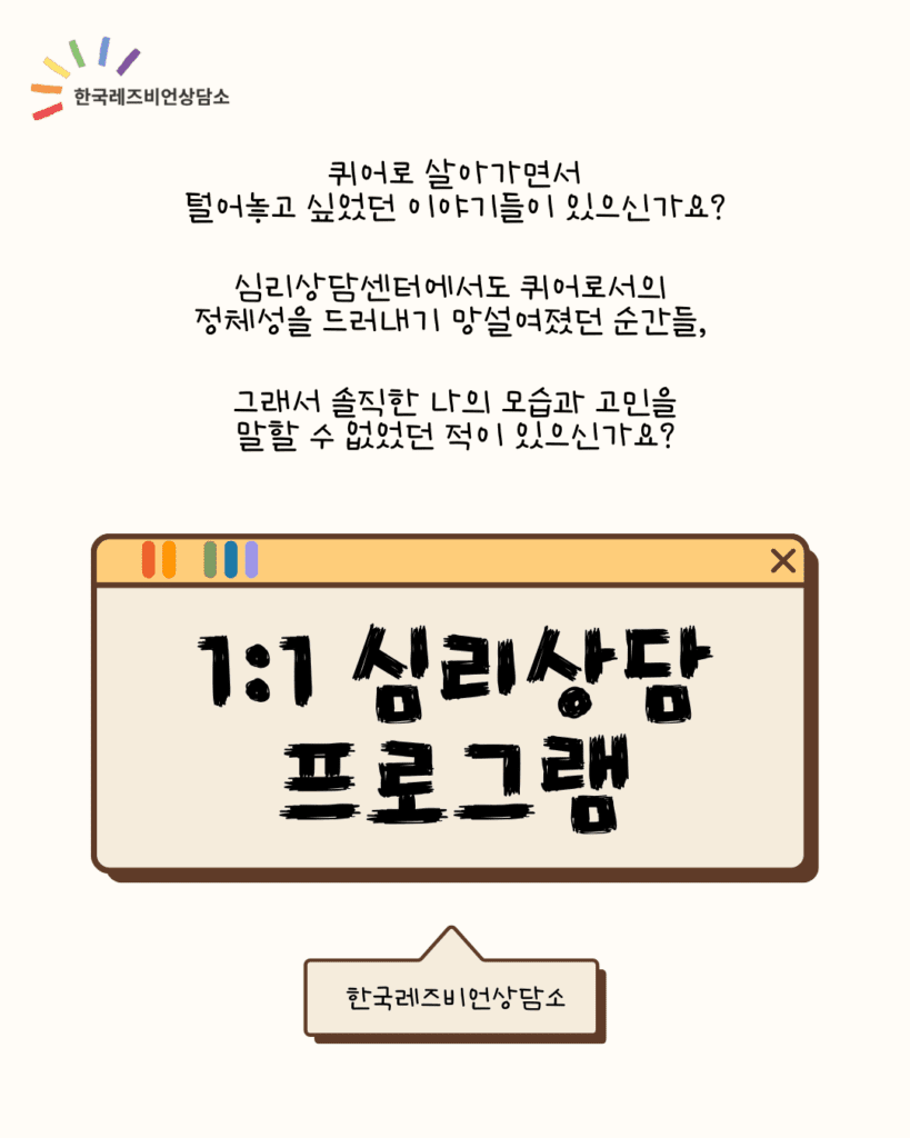 ※ 이 프로그램은 여성 성소수자 인권운동 단체인 한국레즈비언상담소에서 마련한 프로그램입니다. 한국레즈비언상담소 상담팀 소속의 전문 상담심리사 및 임상심리사, 한국레즈비언 상담소에서 상담 교육을 이수한 동료 상담가들이 진행합니다.