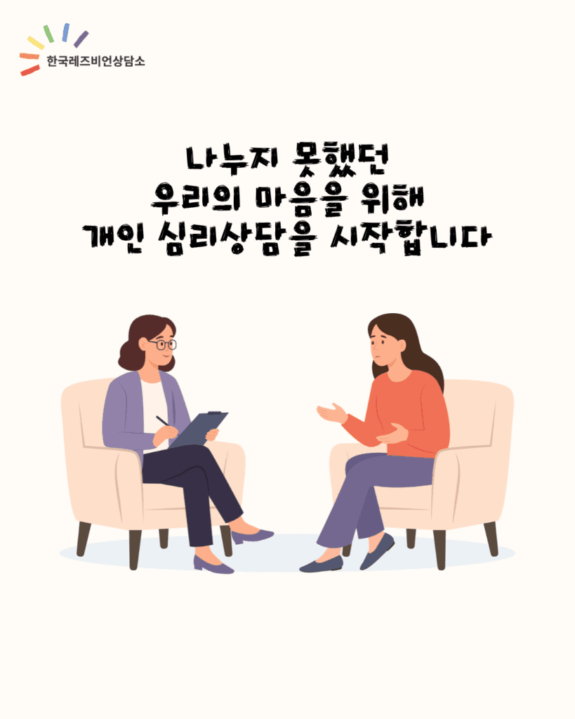 주변 사람들에게 털어놓지 못한 당신의 이야기와 누군가 들어주고 함께 견뎌줬으면 하는 마음을 위해 한국레즈비언상담소 상담팀에서 1:1 개인 심리상담 프로그램을 준비했습니다.