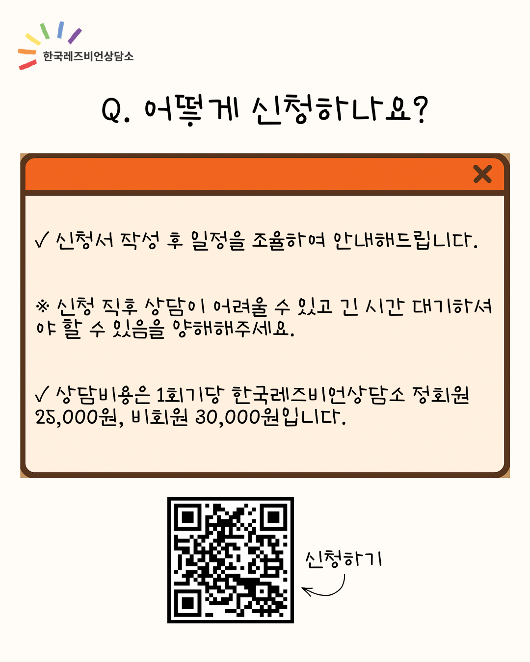 - 📍어디서 : 한국레즈비언상담소 사무실(비대면 상담 가능) *서울 영등포시장역 인근, 주소 개별 안내