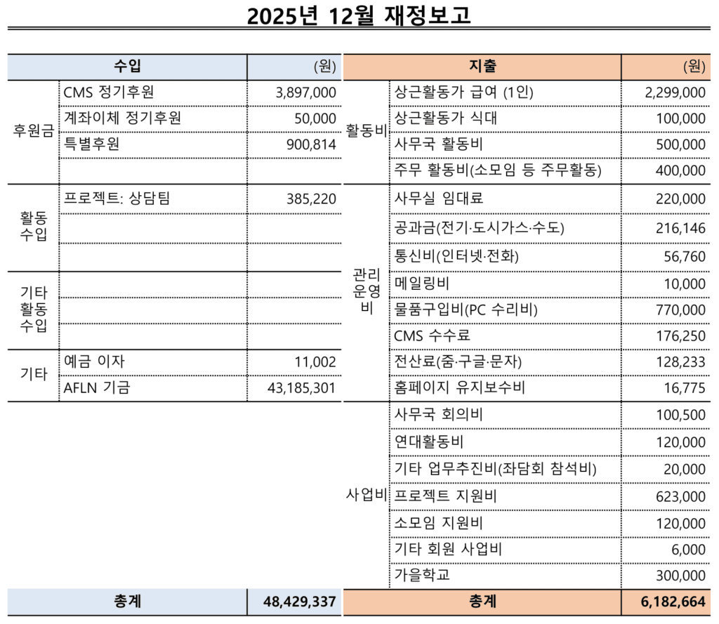 • 신규 사무국 활동가분들이 인큐베이팅 기간을 종료하고 정식으로 사무국에 합류했습니다(사무국 활동비 증가, 12월 기준 간사 외 사무국 활동가 5인).