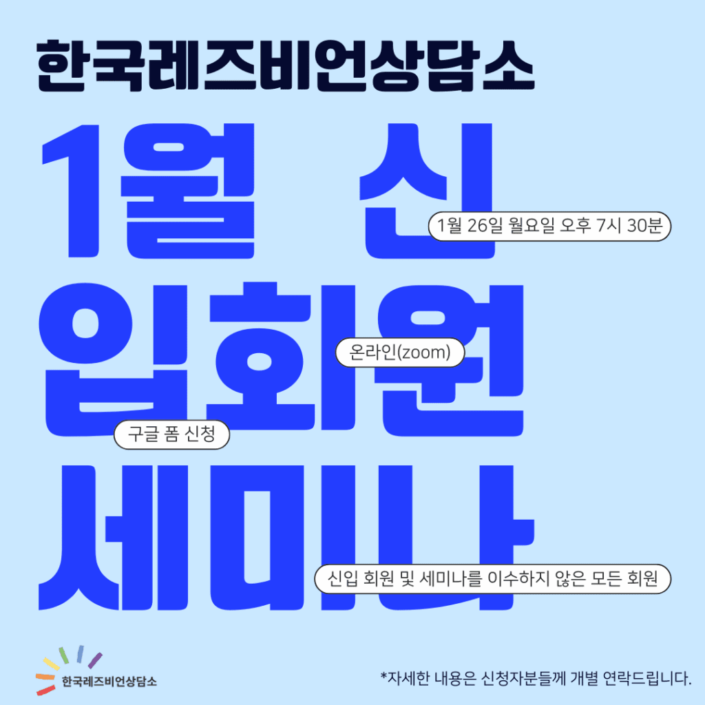 2026년 1월 한국레즈비언상담소 신입회원세미나 일정입니다. 🙌
