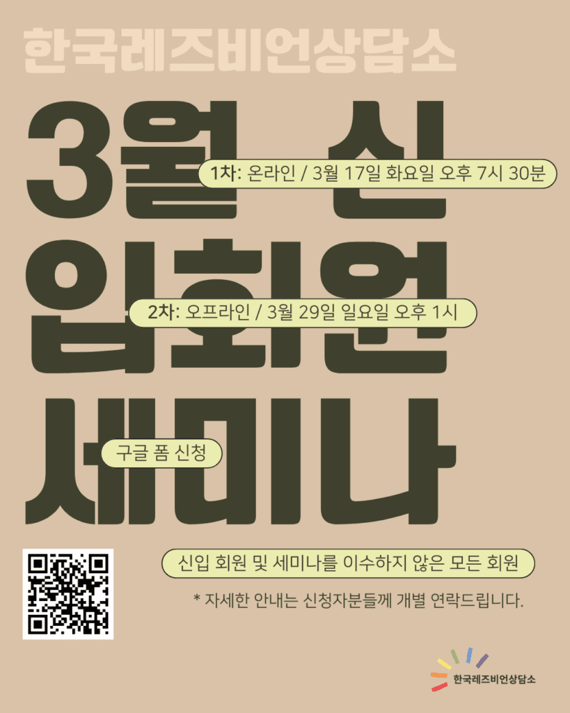 2026년 3월 한국레즈비언상담소 신입회원세미나 일정입니다. 🙌