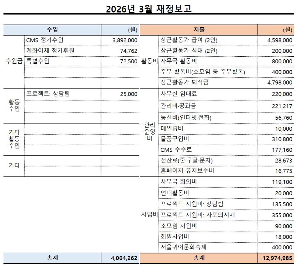 • 상근활동가 퇴직금 지급이 있었습니다. 퇴직 시기에 맞추어 새로운 상근활동가 채용이 이루어져서 상근활동가 2인 체제는 지속됩니다.