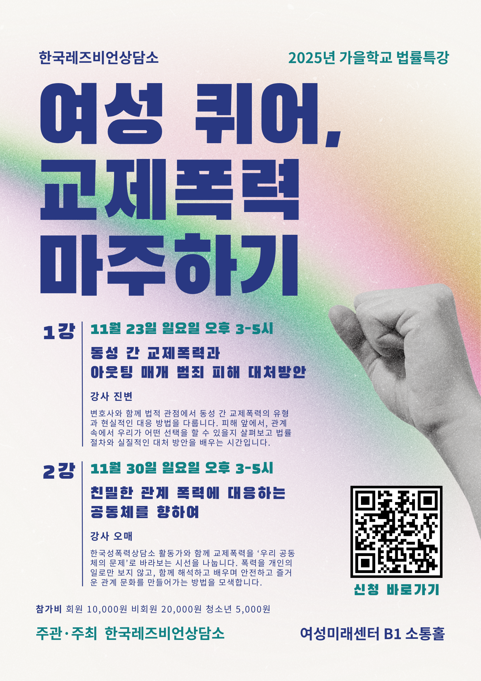 한국레즈비언상담소는 이번 2025년 가을학교 법률특강을 통해, 이러한 관계 속 폭력과 정면으로 마주하는 자리를 마련했습니다.
