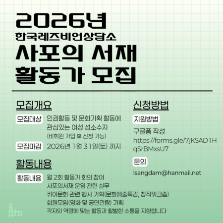 한국레즈비언상담소 사포의서재에서 자원활동가를 모집합니다.